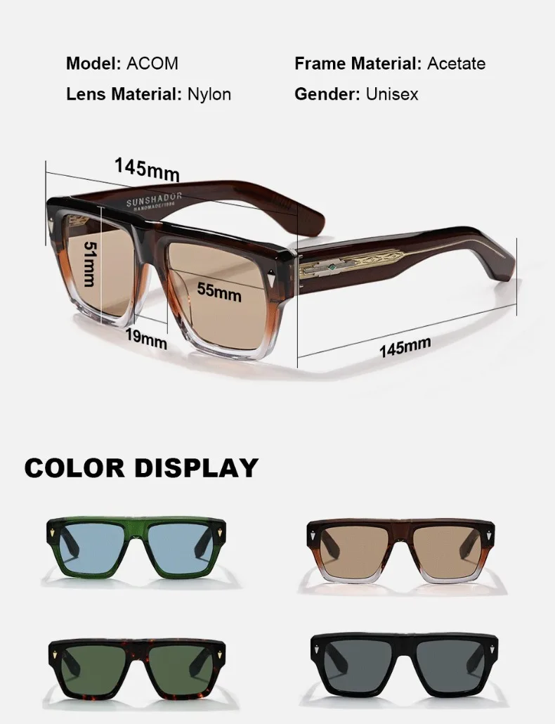 QIRONG SACOMA sunglasses offer a perfect balance of classic retro style and modern versatility, designed for both men and women. Featuring a bold square silhouette and a full-frame acetate construction, these sunglasses deliver a confident look with a comfortable, durable feel. The timeless design makes them an easy choice for outdoor activities, travel, or everyday wear, effortlessly complementing a wide range of personal styles.