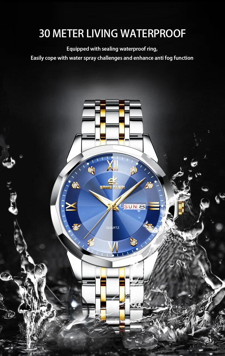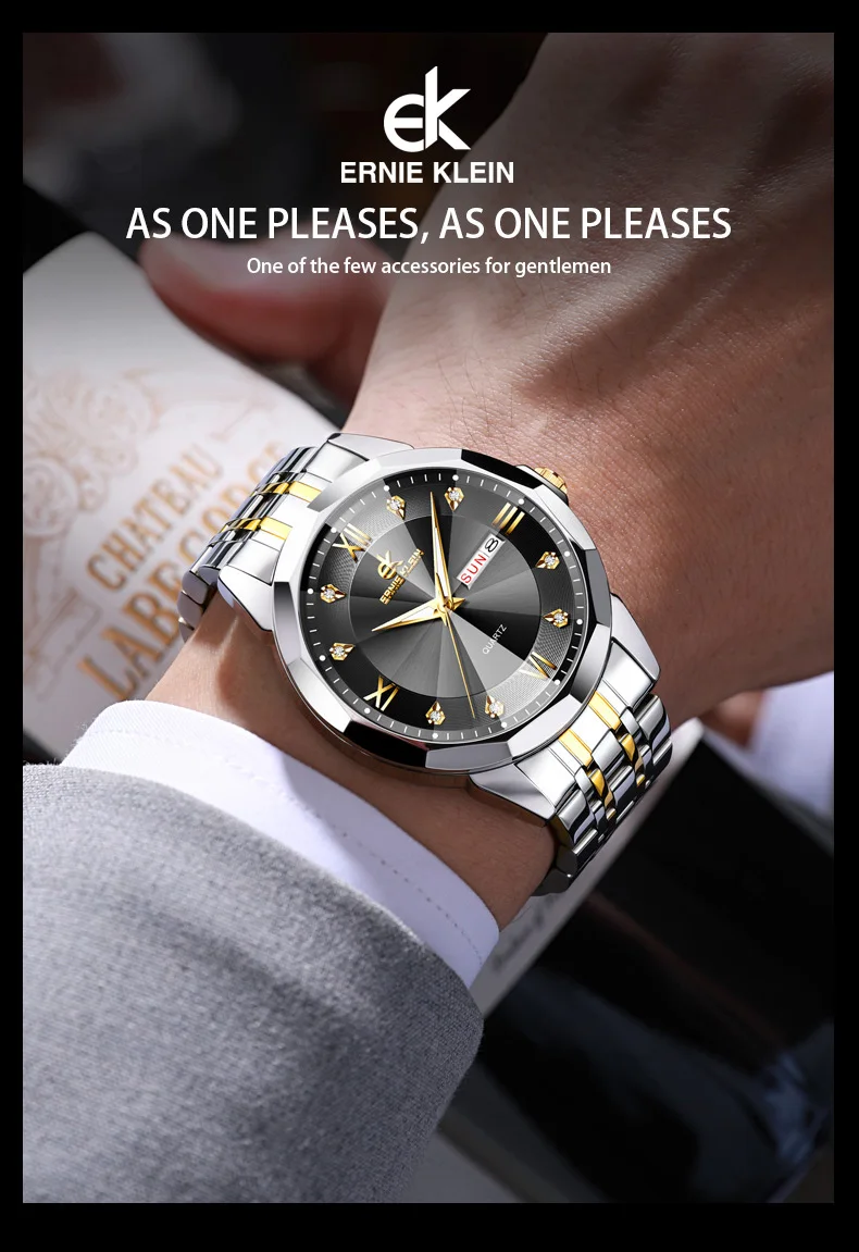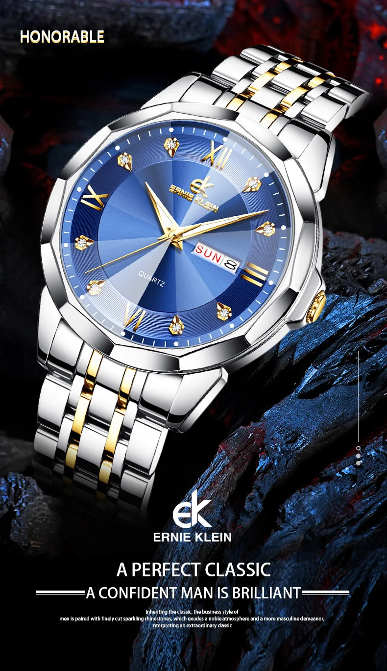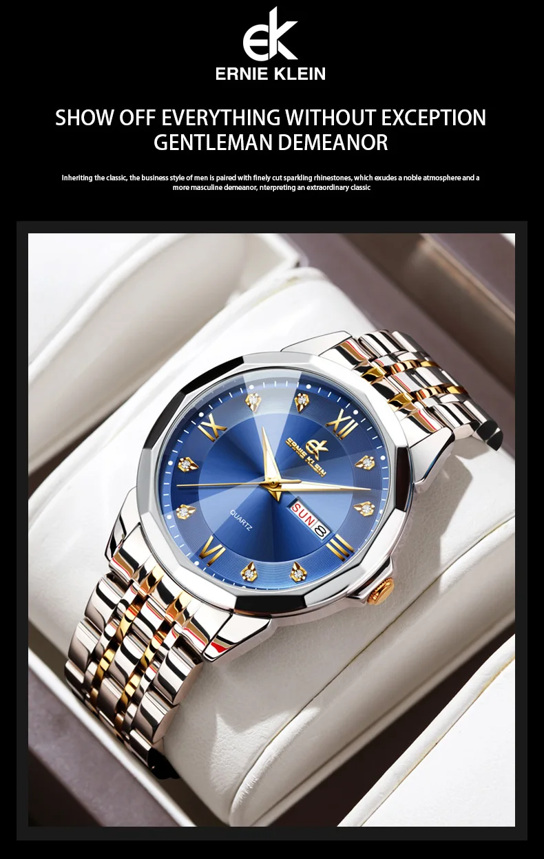 Powered by a reliable quartz movement, this watch includes practical features such as luminous hands, a complete calendar with week display, and water resistance suitable for daily activities and swimming. With its balanced design and elegant presence, the ERNIE KLEIN 3259G is a versatile accessory that blends luxury appeal with dependable performance
